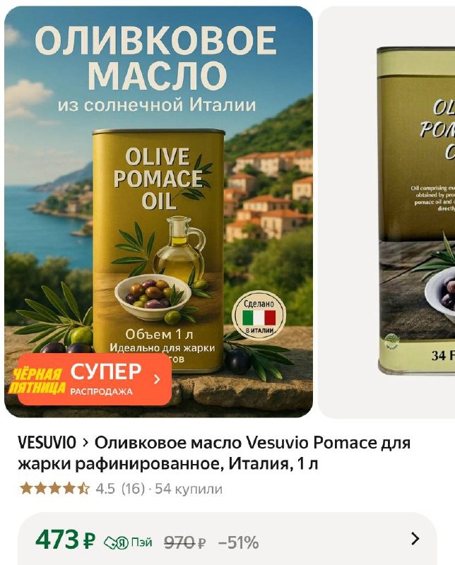 Оливковое масло Vesuvio Pomace для жарки рафинированное, Италия, 1 л