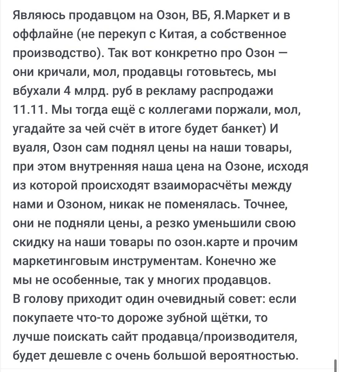 Не согласен, но мнение имеет право на жизнь. Чем подкупают МП? Возврат. Все. Даже если цена (вдруг) чуть больше чем у производителя, мне психологически легче купить на МП, ибо потом просто приношу взад и все :) Пока можно так делать, я готов переплачивать. Ну и второй плюс - ПВЗ в соседней парадной. Поэтому никуда МП не денутся ближайшие 5-7 лет. Русский ИТ бизнес