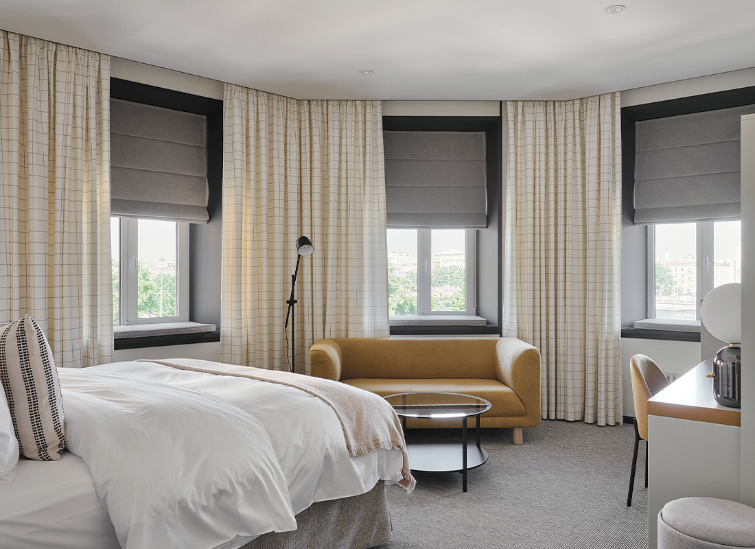 Бутик-отель Glinz представляет собой современное заведение, сочетающее исторический стиль и стандарты комфорта. Расположенный в Петроградском районе Санкт-Петербурга, он предлагает гостям возможность ознакомиться с городом с иной стороны, погрузившись в атмосферу уюта и эстетики. Здание отеля — это пятиэтажная историческая постройка в стиле модерн, украшенная яркими маркизами. Его фасад и окружающая набережная выполнены из гранита, создавая впечатление сказочного городка, где каждый элемент архитектуры бережно восстановлен. Внутри сохранились такие исторические детали, как изразцовые печи, своды и лестница из путиловского камня, что придает интерьеру особую атмосферу прошлого, дополненную современными элементами. Дизайн интерьера выполнен в теплых тонах с минималистическими акцентами. Используются натуральные материалы: деревесные пни в качестве прикроватных тумб, шторы из английского хлопка, мягкие пледы. Такой подход подчеркивает природную эстетику и экологичность, что ценится совре