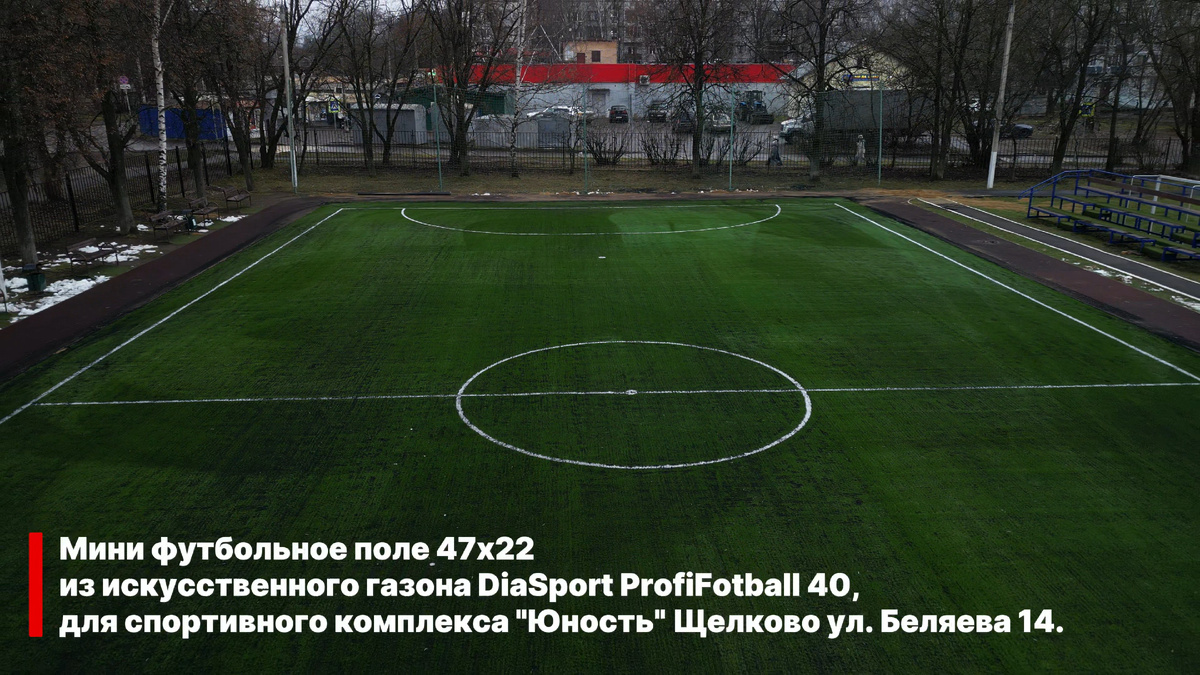 ДиаСпорт завершил монтаж мини-футбольного поля в Щёлково — надёжно, быстро, по-профессиональному! Компания **DiaSport** успешно завершила очередной проект в рамках программы модернизации спортивной инфраструктуры Подмосковья: на территории спортивного комплекса **«Юность»** (г. Щёлково, ул. Беляева, 14) установлено современное мини-футбольное поле размером **47×22 метров** из высококачественного искусственного газона **DiaSport ProfiFootball 40**. 🔥 Почему именно **ProfiFootball 40**? Это профессиональное покрытие создано для интенсивных тренировок и соревнований. Его ключевые преимущества: ✔ Высота ворса — 40 мм, что обеспечивает оптимальный баланс между амортизацией и скоростью игры; ✔ Специальная структура нитей и повышенная плотность (более 13 000 ворсинок/м²) гарантируют износостойкость даже при круглогодичной эксплуатации; ✔ УФ-стабилизированный состав предотвращает выцветание и сохраняет насыщенный зелёный цвет в течение многих лет; ✔ Продуманная дренажная система