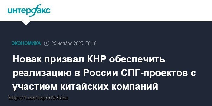 Новак обратился к КНР с просьбой гарантировать выполнение в России проектов по сжиженному природному газу, в которых принимают участие китайские компании. Интерфакс сообщает, что Россия обращается к Китаю с просьбой создать все необходимые условия для успешного выполнения российских арктических проектов по сжижению природного газа (СПГ), в которых задействованы китайские компании. Allesasia.com - Ваш помощник в бизнесе с Китаем https://www.interfax.ru/business/1059689