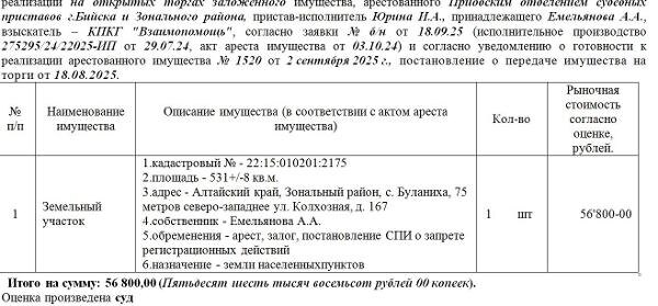 Название: Лот№2 Земельный участок, кад. № 22:15:010201:2175, S-531+/-8 кв.м., адрес: АК, Зональный р-н, с. Буланиха, 75 метров северо-западнее ул. Колхозная, д. 167. Нач. цена 48280 руб. (Емельянова А.А., арест, залог, постановление СПИ о запрете р/д) (1520) (повторные) Канал: Госземля Алтайский край Область: край Алтайский АК Район: Зональный р-н Населенный пункт: с. Буланиха, 75 метров северо-западнее ул. Колхозная, д. 167. Локация: Смотреть на карте ВРИ: - Кадастровый номер: 22:15:010201:2175 Кадастровая стоимость: - Вид сделки: Продажа Площадь: 531 м² Начальная цена: 48280.00 руб. Дата завершения: 17.12.2025 Подробнее: ГИС ТОРГИ #госземля #земляотгосударства #земля #земельныйучасток #земельныеторги #торги #аукцион #продажаземли #продажа #алтайскийкрай