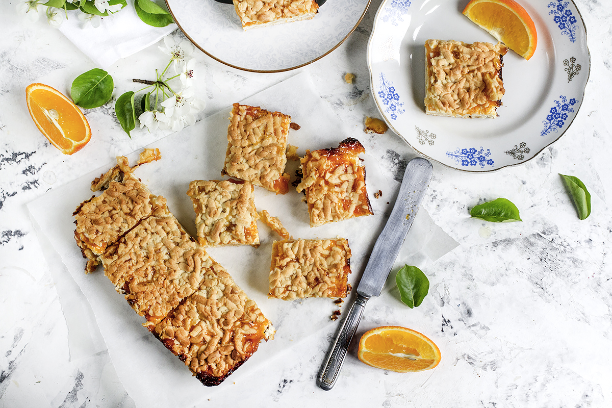 11. Выложите творожную начинку, затем слой абрикосового варенья, апельсиновую цедру и кусочки мяк