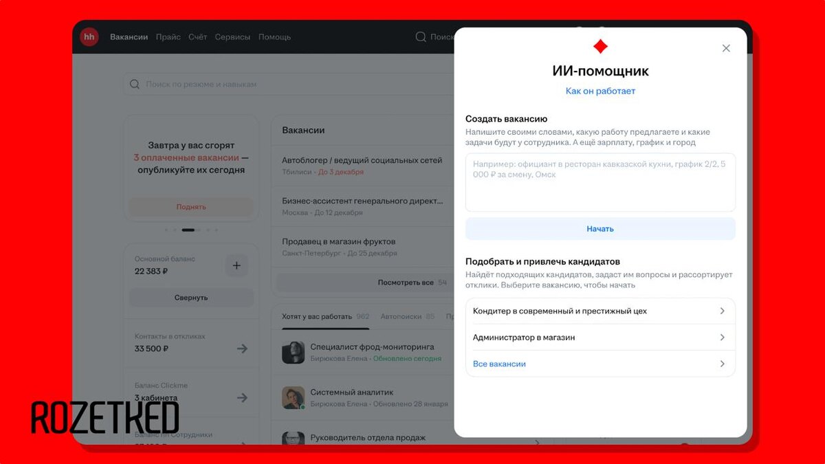 HeadHunter запустил «ИИ-помощника» в помощь рекрутерам Ассистент автоматизирует процессы: помогает составить текст вакансии, отправляет приглашения, разбирает отклики и ведёт первичное общение с кандидатами. HR-специалисты оценят краткие выжимки и сортировку откликов по степени соответствия. В HeadHunter подчёркивают, что это не замена рекрутеров, а помощник, который забирает на себя рутинные задачи. Пока ассистент работает в пилотном режиме, официальный запуск запланирован на начало 2026 года. rozetked.me/news/42924