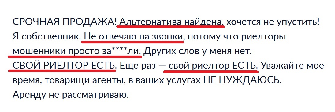 Вот очередной скрин из объявления собственника. Описание объявления — это дополнение к стандартным характеристикам квартиры, в котором мы указываем все привлекательные особенности квартиры, т. е. показываем уникальность нашего предложения. Прочитайте описание, давайте оценим текст по порядку. Агрессивный тон и использование ненормативной лексики создают негативное впечатление и могут оттолкнуть не только агентов, но и покупателей. Вместо описания преимуществ жилья автор фокусируется на своих проблемах с риелторами, повторяясь и используя эмоционально окрашенные высказывания. Не очень понятно, зачем собственник продает сам, если у него есть риэлтор. Квартира продается с начала марта, поэтому, вероятно, достигать каких-либо договоренностей с собственником очень сложно. В итоге объявление оказывается неэффективным: оно не презентует объект, не привлекает покупателей, а создает конфликтную атмосферу. Не теряйте покупателей, не делайте так!