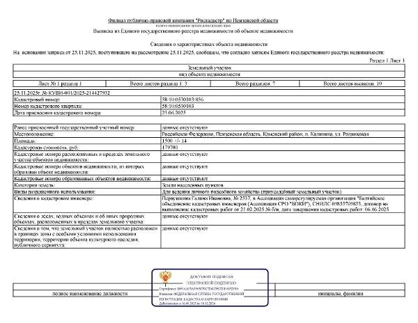 Название: Земельный участок для ведения личного подсобного хозяйства, площадью 1500 кв.м. из земель населенных пунктов, расположенный по адресу: РФ, Пензенская область, Каменский район, п.Калинина, ул.Родниковая, с видом разрешенного использования "для ведения личного подсобного хозяйства (приусадебный земельный участок)" Канал: Госземля Пензенская область Область: обл Пензенская Пензенская область Район: Каменский район Населенный пункт: п.Калинина, ул.Родниковая Локация: Смотреть на карте ВРИ: Для ведения личного подсобного хозяйства (приусадебный земельный участок) Кадастровый номер: 58:10:0530103:856 Кадастровая стоимость: - Вид сделки: Аренда Площадь: 1500 м² Начальная цена: - руб. Дата завершения: 25.12.2025 Подробнее: ГИС ТОРГИ #госземля #земляотгосударства #земля #земельныйучасток #земельныеторги #торги #аукцион #арендаземли #аренда #пензенскаяобласть