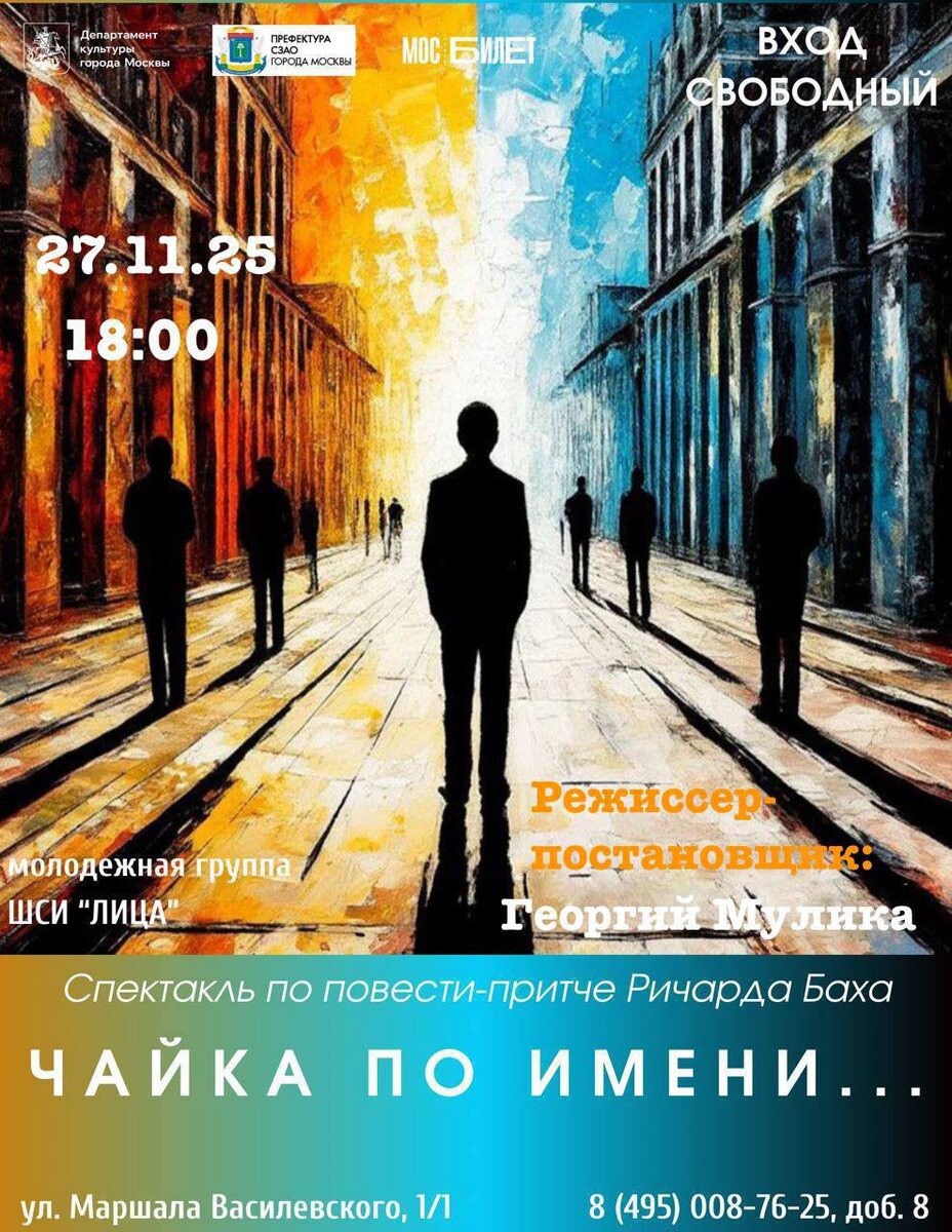 ✨ Приглашаем вас на спектакль «Чайка по имени…» — последний в этом году! И вновь на наших театральных подмостках — трогательный и вдохновляющий спектакль по повести-притче Ричарда Баха. Постановку представляет юношеская группа школы сценического искусства «Лица» (12+). 🎬 Режиссёр-постановщик: Георгий Мулика 🎨 Художественный руководитель: Марьяна Шапкина Это история о чайке, которая мечтает прожить жизнь не в поисках простой пищи, а в стремлении к высоким целям: дружбе, надежде и любви. Постановка полна символов и метафор — присмотритесь, и вы увидите гораздо больше, чем кажется на первый взгляд. 📅 27.11.2025 ⏰ 18:00–19:00 📍 ул. Василевского, д. 1, к. 1 💥 Вход свободный! Приходите поддержать наших актёров — они играют честно, открыто и с яркими эмоциями. Ждём вас! #театрлица #чайкапоимени #юныеталантыздесь #театрдлявсех #афиша #приглашение #культура #театр2025 #спектакль #Москва 📱 Подписывайся на наш канал, чтобы не пропустить интересные мероприятия и мастер-классы в СЗАО!