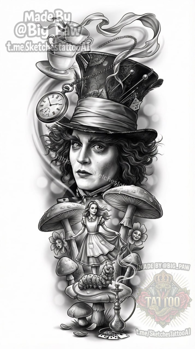 #2827 Подборка по запросу подписчика - можете сделать эскиз на ногу по Алисе в стране чудес ( по фильму ) главный герой шляпник , остальные будут второстепенные , Алиса , грибы ,цветы , гусеница 🧠 SYNTX - тут создан эскиз 💎 Информация - все услуги 💀 Эскизы от нейросети #алисавстранечудес #наногу #персонаж #эскиз #тату #татуировка
