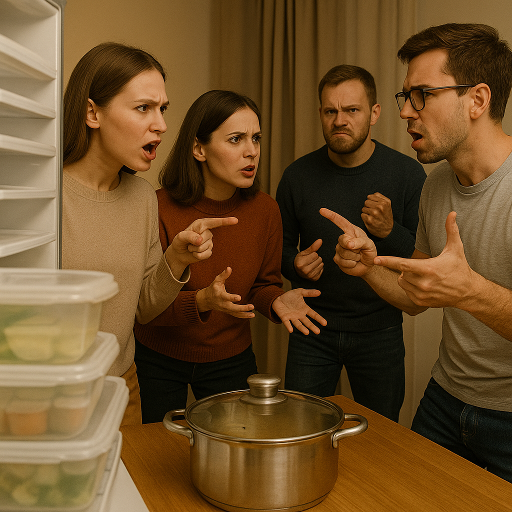 Вечером мы аккуратно убрали суп в холодильник, а утром нашли кастрюлю на столе, а полки забиты контейнерами соседа. С этого начался скандал, который разделил соседей на два лагеря. Утром я зашла на кухню ближе к 7 и включила свет. Полка, которую считали нашей, оказалась пустой без кастрюли. Рядом на решётке стояли три контейнера с лапшой. Крышки легли неровно, из щелей тянуло чесноком и бульоном. Муж ставил суп вчера поздно вечером и аккуратно переставил банки. Первую полку договорились держать для наших продуктов, вторую отдали соседу Артёму, нижнюю оставили общей. Такой порядок сохраняли почти год, споры обходили квартиру стороной. Теперь контейнеры захватили не только нашу полку, ими забился весь холодильник. Дверца закрывалась тяжело, резинка заметно выгнулась. Морозилка тоже заполнилась, там лежали пельмени. Коробка с яйцами получила стикер с именем. От неожиданности перехватило дыхание, раздражение поднялось волной. Первым делом я нашла кастрюлю на столе под полотенцем. Крышка чу