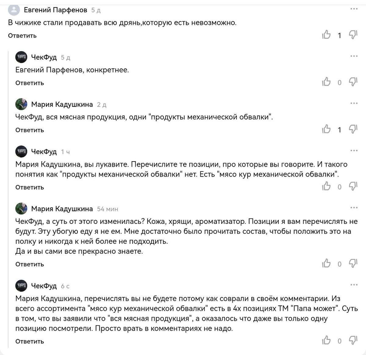 Вот пример, как некоторые потребители любят делать выводы по единичным случаям. Человек заявил, что "вся мясная продукция" в Чижике это "продукты механической обвалки". А оказалось, по словам самой покупательницы, что она посмотрела состав только одной позиции. Какой? Это секрет. И тем более она вообще не ест и не покупает. И вот таких комментаторов хватает. Люди не понимают, что сейчас очень просто проверить информацию и что врать не стоит. Скорее всего она закупается в Азбуке Вкуса. Там то ничего механически не обваливают. Не надо жить в иллюзиях.