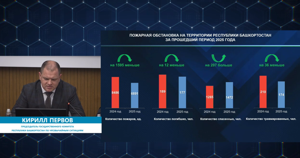 За прошедшую неделю в республике произошло 88 техногенных пожаров, в которых погибли четыре человека, сообщил на оперативном совещании в правительстве председатель Госкомитета РБ по ЧС Кирилл Первов. Из огня удалось спасти 36 человек, пятеро получили травмы различной степени тяжести. Трагедии с гибелью людей произошли в Буздякском, Бурзянском, Караидельском районах, а также в Уфе. Всего с начала года количество пожаров в регионе сократилось на 19 процентов, погибших – на 12 человек. Количество спасенных увеличилось на 207 человек. «В целях профилактики гибели людей на пожарах за минувшую неделю было проведено 922 профилактических рейда с охватом свыше пяти тысяч человек. Было установлено 327 пожарных извещателей», — сообщил спикер. Скриншот видеотрансляции оперативного совещания правительства РБ.