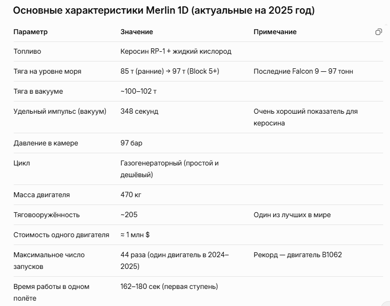 - В 2025 году SpaceX начала постепенно выводить Merlin из новых заказов — всё больше клиентов выбирают Starship, но Falcon 9/Merlin будут летать минимум до 2030 года (Starlink v2/v3, много военных и коммерческих контрактов).
