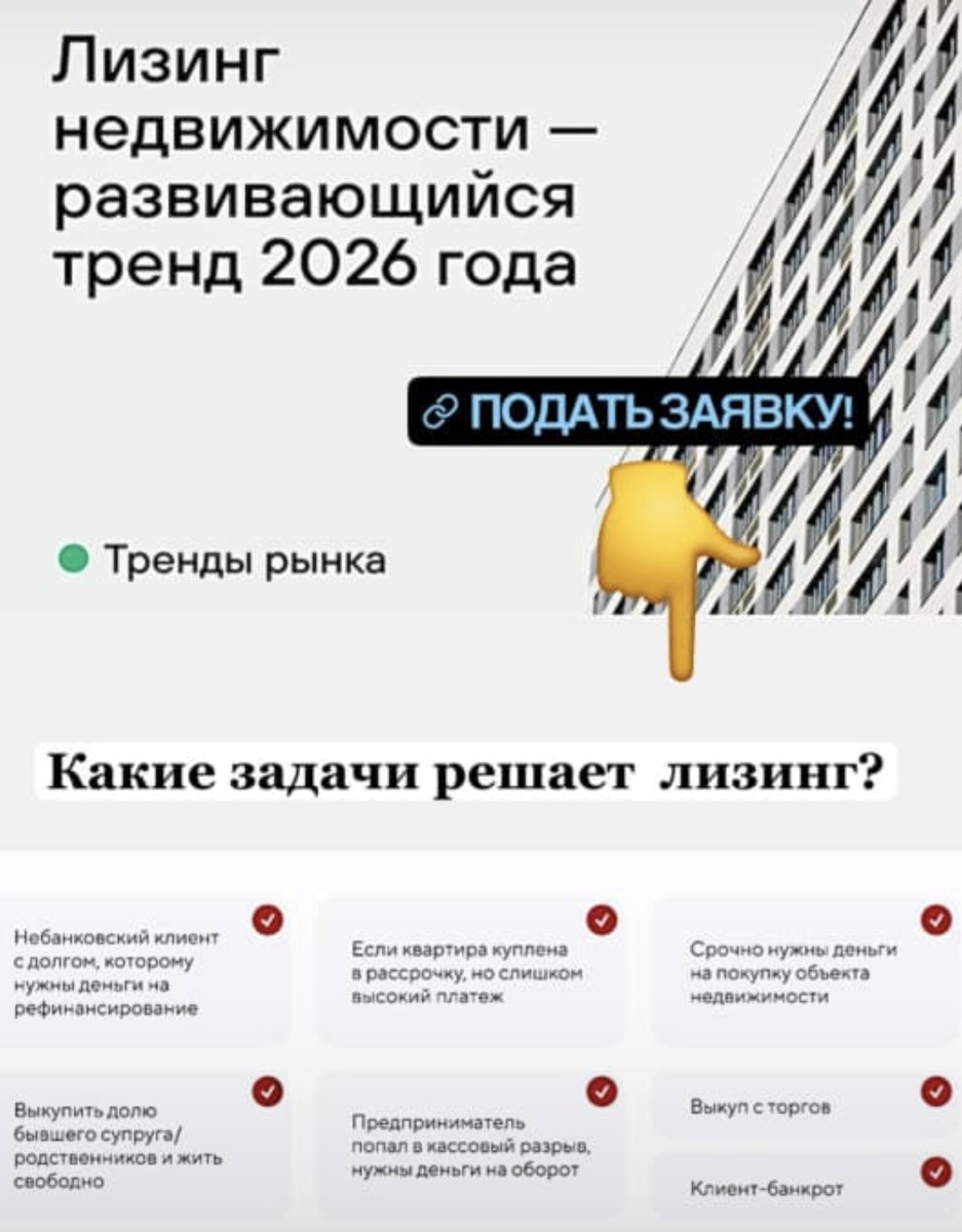 Пока банки ужесточают требования, а ставки остаются высокими — для умных покупателей нашла решение. 👉 ЧТО ТАКОЕ ЛИЗИНГ НЕДВИЖИМОСТИ? Это схема, где компания покупает выбранную вами квартиру и передаёт её вам в долгосрочную аренду с правом последующего выкупа. Фактически — это гибкая альтернатива ипотеке! 🔥 ДЛЯ КОГО ЭТО РЕШЕНИЕ? Это люди с разными жизненными ситуациями: ✅ Небанковские клиенты с долгами, нуждающиеся в рефинансировании ✅ Те, кто хочет выкупить долю бывшего супруга или родственников ✅ Владельцы квартир в рассрочке с высокими платежами ✅ Предприниматели в кассовом разрыве, нуждающиеся в оборотных средствах ✅ Те, кому срочно нужны деньги на покупку недвижимости ✅ Покупатели на торгах и даже клиенты в статусе банкрота 🎯 КЛЮЧЕВЫЕ ПРЕИМУЩЕСТВА: • Минимальный первоначальный взнос • Гибкий график платежей • Лояльные требования к доходам • Возможность досрочного выкупа • Налоговые преимущества для ИП и юрлиц • Прозрачные ежемесячные платежи 📌 КАК ЭТО РАБОТАЕТ? 1.