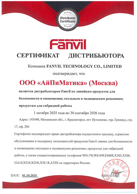 Компания АйПиМатика подтверждает свой статус ключевого дистрибьютора домофонов Fanvil и объявляет о масштабном расширении контракта. В этом году мы отмечаем важный юбилей — 10 лет успешной работы с решениями вендора. За это время мы заняли лидирующие позиции по продажам домофонии и отельных телефонов бренда. С 01 октября 2025 года мы начали дистрибуцию решений Fanvil и Linkvil для видео- и аудио-конференц-связи. Этот стратегический шаг направлен на создание максимально сбалансированного продуктового предложения. Если потребности среднего и высокого ценовых сегментов в нашем портфеле традиционно закрывают решения ВКС Yealink, то оборудование Fanvil и Linkvil призвано занять нишу доступных, бюджетных решений. "Мы видим высокую востребованность на рынке гибридных и BYOD-решений, доступных широкому кругу заказчиков. Включение в портфель недорогих, но функциональных устройств Fanvil для видео- и аудиоконференций позволяет нам закрыть бюджетный сегмент. Диверсифицируя наш портфель по этому