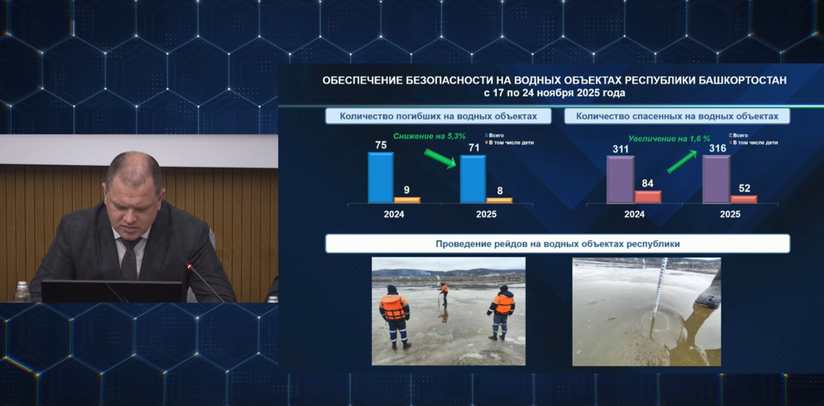 В Белорецком и Учалинском районах республики толщина льда на прудах и озерах уже достигла семи сантиметров, сообщил на оперативном совещании в правительстве председатель Госкомтета РБ по ЧС Кирилл Первов. Невзирая на то, что из-за аномально теплой погоды лед на водоемах республики отсутствует, в гористой местности ситуация иная. Так в Белорецком и Учалинском районах толщина льда на прудах и озерах уже достигла семи сантиметров. В связи с чем спикер напомнил жителям и гостям Башкирии, что безопасная толщина льда составляет более 10 сантиметров. «В рамках обеспечения безопасности на водных объектах за отчетный период проведено 1 194 профилактических мероприятия с охватом 4 288 человек. С начала года число погибших на воде сократилось в республике на четыре человека, а спасенных увеличилось на пять человек», – сообщил Кирилл Первов. За неделю по системе «112» поступило 53 516 сообщений, в то числе о том, что в Чекмагушевском районе двое мужчин спустились в бункер очищенного зерна, потерял