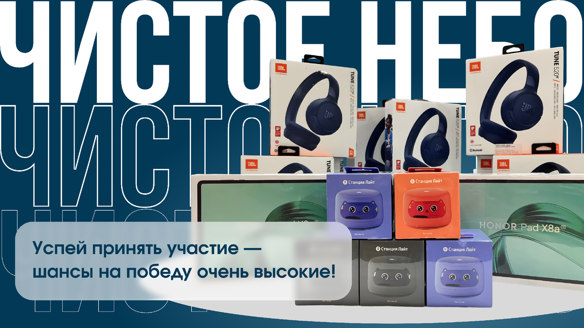 Напоминаем, что в сообществе «ВКонтакте» ЖК «Чистое небо» проходит масштабный розыгрыш. Успей принять участие — шансы на победу очень высокие! Ознакомиться с условиями розыгрыша можно по ссылке. Победителей будет не 1, не 2 и даже не 3, а сразу 23! Призы уже ждут своих счастливых владельцев. Честно говоря, на фото поместилось далеко не всё!
