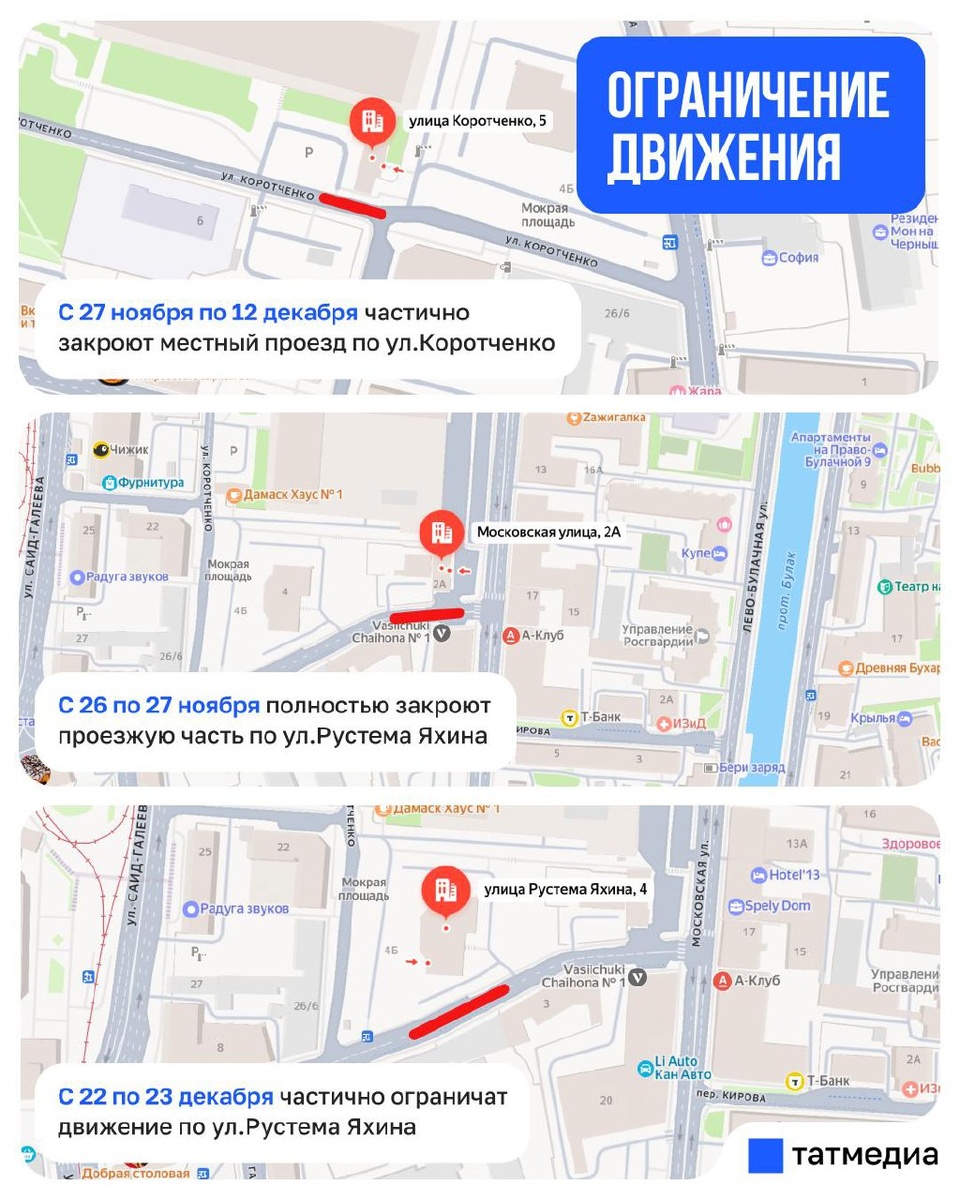 В ответ на пост 🚧🚗 В Казани частично ограничат движение транспорта по ряду улиц Причина – проведение работ по размещению водопровода. 🔹С 27 ноября по 12 декабря частично закроют местный проезд по ул.Коротченко в районе дома №5. 🔹С 26 по 27 ноября полностью закроют проезжую часть по ул.Рустема Яхина, в районе дома №2а по ул.Московская. 🔹С 22 по 23 декабря частично ограничат движение по ул.Рустема Яхина, в районе дома №4. @tatmediaofficial | Все каналы Татмедиа ™️ 1-й новостной MAX-канал Татарстана - подпишитесь.
