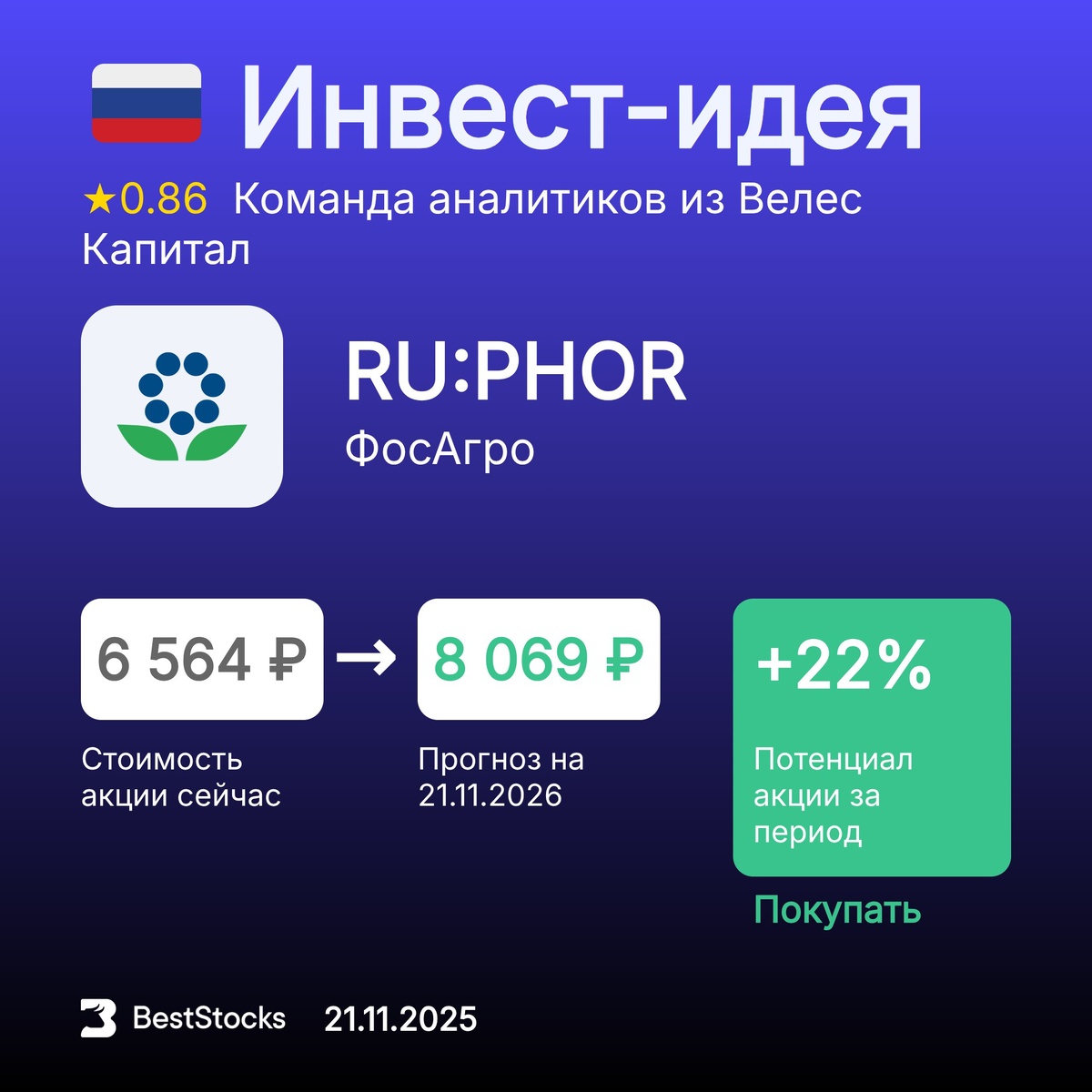 🇷🇺 Инвест-идеи по русским акциям Прогноз по акции ФосАгро Прогнозная цена: 8069 ₽ (+22%) Рекомендация: Покупать Дата прогноза: 21.11.2025 Прогноз до: 21.11.2026 Инвест-компания: Велес Капитал Автор прогноза: Команда аналитиков Ещё рекомендации на сегодня → ••••• ❓ Брокер перестал показывать стоимость портфеля? Это можно исправить — BestStocks сделал специальный бесплатный инструмент, который показывает стоимость всех акций в вашем портфеле в реальном времени. Попробовать бесплатно