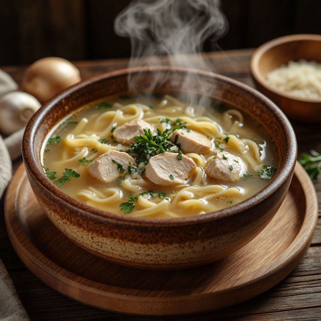 Есть в мире особые ароматы, которые работают как машина времени. Один глоток - и ты уже не на своей кухне, а в бабушкином доме. Ноги болтаются на стуле, за окном метель, а перед тобой дымится глубокая тарелка. Золотистый бульон, тонкие завитки домашней лапши, нежные кусочки курицы... Это куриная лапша. Не просто суп, а состояние души.