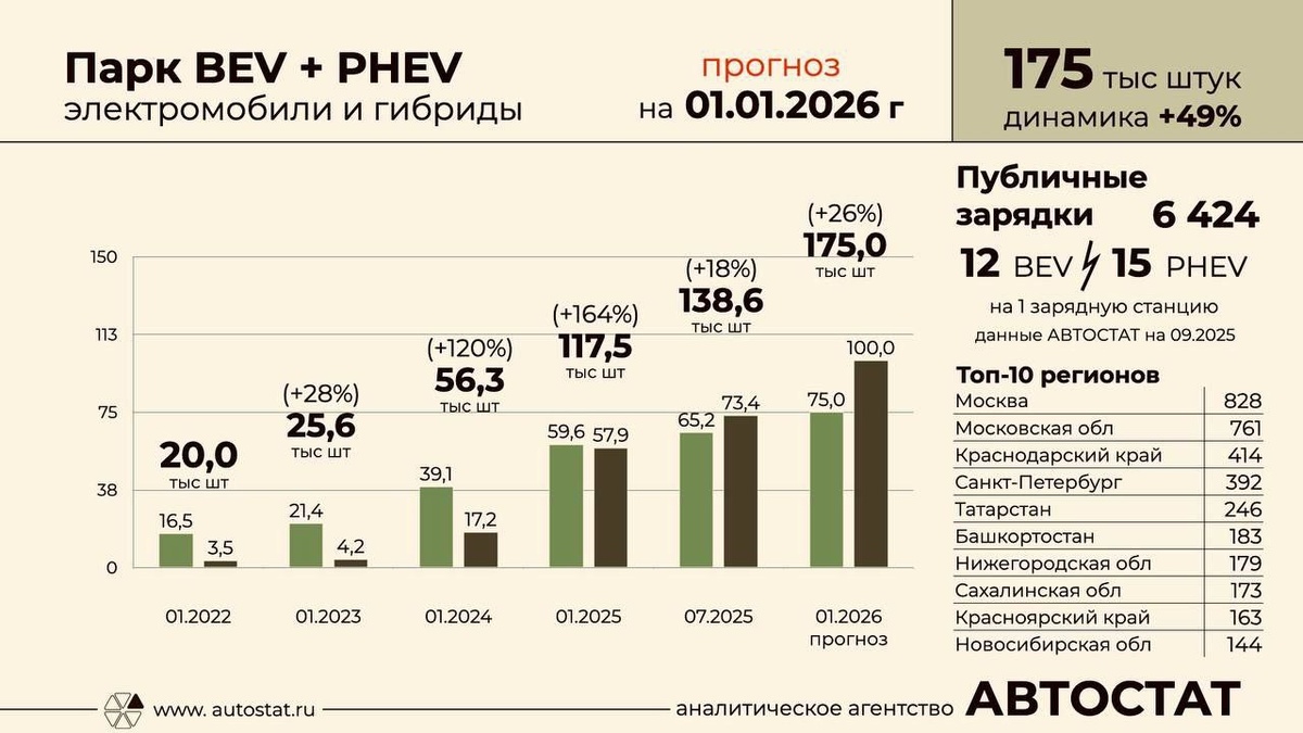 Парк электромобилей в России вырастет до 175 тысяч уже к началу 2026 года По данным АВТОСТАТ, число BEV и PHEV в стране может достичь 175 тыс. — при текущих 138,6 тыс. и почти 50% годового прироста. Быстрее всего растут подключаемые гибриды (+73%), тогда как чистые электрокары прибавляют +26%. Пополнение идёт не только за счёт новых продаж, но и активного ввоза подержанных EV и PHEV. [**ДВЕ ЗАРЯДКИ](https://dzen.ru/id/65689138a0eb1c67698b054c 🔋 #работа, #вакансия, #заработок, #деньги, #подработка, #работасейчаc, #водитель, #водителю, #работаводителем, #такси, #таксист, #работавтакси, #курьер, #работакурьером, #доставка, #доставкаеды, #ЯндексЕда, #DeliveryClub, #ЯндексТакси, #Ситимобил, #ЯндексРабота, #Таксиру, #Uber, #UberEats, #GetTaxi, #авто, #автомобиль, #работанаавто, #работанаавтомобиле,, #арендаавто, #такспарк, #ищуработу, #вакансии