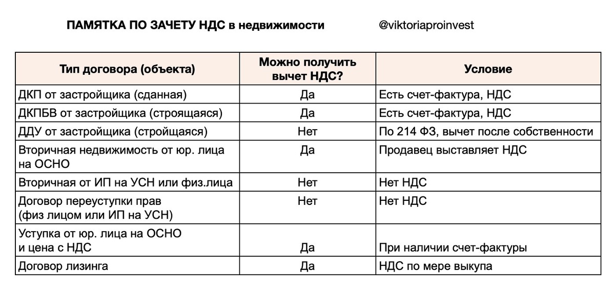 Зачет НДС в недвижимости 💡Небольшая памятка для тех инвесторов и владельцев бизнеса, кто покупает недвижимость для оптимизации своей налоговой нагрузки. Ее снижение при вычете НДС возможно за счёт уменьшения суммы налога, подлежащей к оплате в бюджет. Какую недвижимость можно приобрести с вычетом НДС? Это может быть как покупка офиса, торгового помещения, ГАБ, машиноместа или кладовки. Получить вычет НДС можно и с новостройки и со “вторички” при выполнении условий. Подробнее составила в таблице Если остались вопросы, разбираем на консультациях и подбираем максимально выгодную коммерцию)