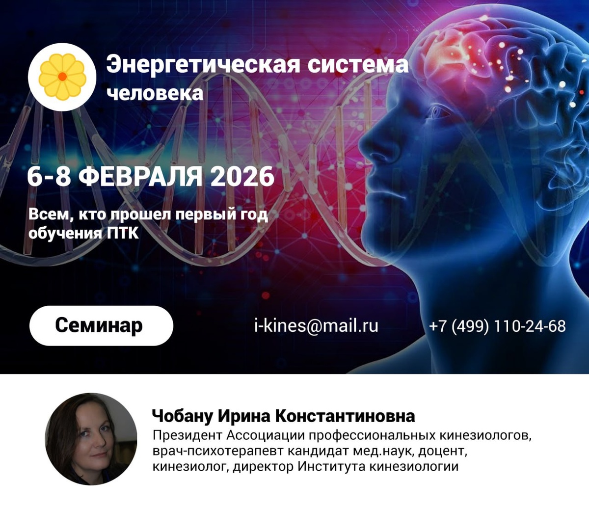 Дорогие друзья!🌿 Началась запись на семинар "Энергетическая система человека", который будет проведен с 6 по 8 февраля 2026 года Семинар проводит Чобану Ирина Константиновна — кинезиолог, инструктор ПТК, врач-психотерапевт, президент АПК и Института Кинезиологии 💫 На этом семинаре мы обсудим научные подтверждения существования энергетических систем человека 💫 Особое внимание мы уделим системе семи энергетических тел человека: их сути и проявлениям ✅ А главное, мы разберем и освоим возможности коррекции отклонений. Для каждого из семи энергетических тел мы разберем отдельные коррекции. Подробнее о семинаре можно узнать в личных сообщениях группы ВК или по ссылке — https://i-kines.ru/energeticheskie-sistemy-cheloveka/