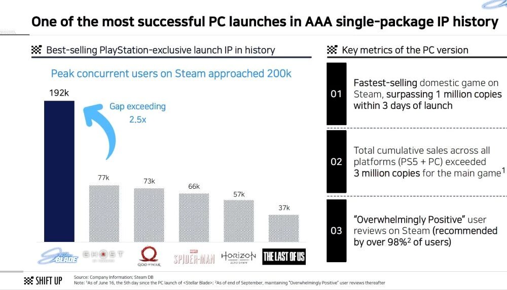 Студия Shift Up, разработчик экшен-RPG Stellar Blade, официально подтвердила, что ПК-версия игры превзошла все ранее портированные на ПК одиночные проекты издательства PlayStation, став самым успешным ПК-релизом среди всех бывших эксклюзивов PlayStation. И все это игра от сторонней студии, а не внутренней студии Sony. В своих слайдах компания говорит в первую очередь об одновременном онлайне в Steam, но и в продажах проект, очевидно, остальных тоже опережает. И все это после того, как ПК-версия превзошла по темпам продаж версию Stellar Blade для PlayStation 5 — на ПК игра продалась миллионом копий за три дня, а на PS5 — за два месяца. https://youtu.be/I6rVjbzIwc8