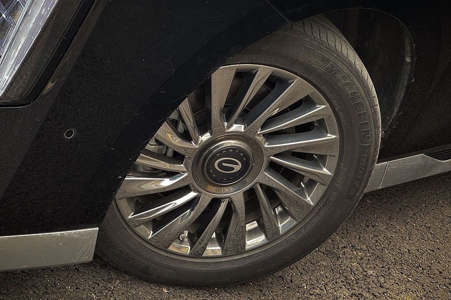 На фоне монументального кузова напрочь теряются 18-дюймовые колёса в арках, хотя дизайн дисков, надо сказать, весьма симпатичен. Ступичные колпачки – с самовыравнивающимися вставками, как на люксе. Цветов кузова в России всего три: чёрный, белый и кофейный, который вживую я видел всего один раз. На домашнем китайском рынке GAC предлагает для М8 ещё и элегантный синий цвет. Более того, есть и другой дизайн радиаторной решётки.