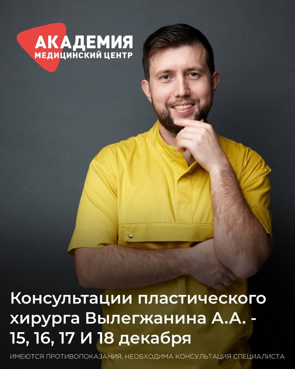 В МЦ «Академия» открыта запись на декабрь к пластическому хирургу из Санкт-Петербурга! 📅 15, 16, 17 и 18 декабря у вас есть возможность попасть на приём к Андрею Александровичу Вылегжанину - пластическому, челюстно-лицевому хирургу, врачу высшей категории с большим опытом и филигранным подходом. 💬 Его специализация — эстетика лица: ⭕️ Ринопластика и риносептопластика ⭕️ Омолаживающие операции на лице и шее ⭕️ Маммопластика ⭕️ Отопластика ⭕️ Липосакция 📍 Приём проходит в филиале МЦ «Академия» на ул. Красноармейская, 2 Запись на консультацию через👇 — телефон 📞 +7 8422 27-05-05 и +7 927 809-23-46 — сайт 🌐 academy-med.ru — телеграм 🌐 @Academychat73 📌 Количество мест ограничено.