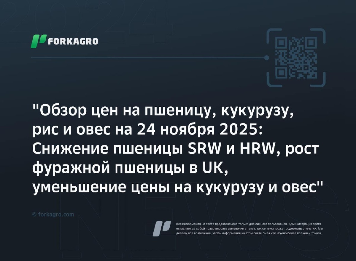 "Обзор цен на пшеницу, кукурузу, рис и овес на 24 ноября 2025: Снижение пшеницы SRW и HRW, рост фуражной пшеницы в UK, уменьшение цены на