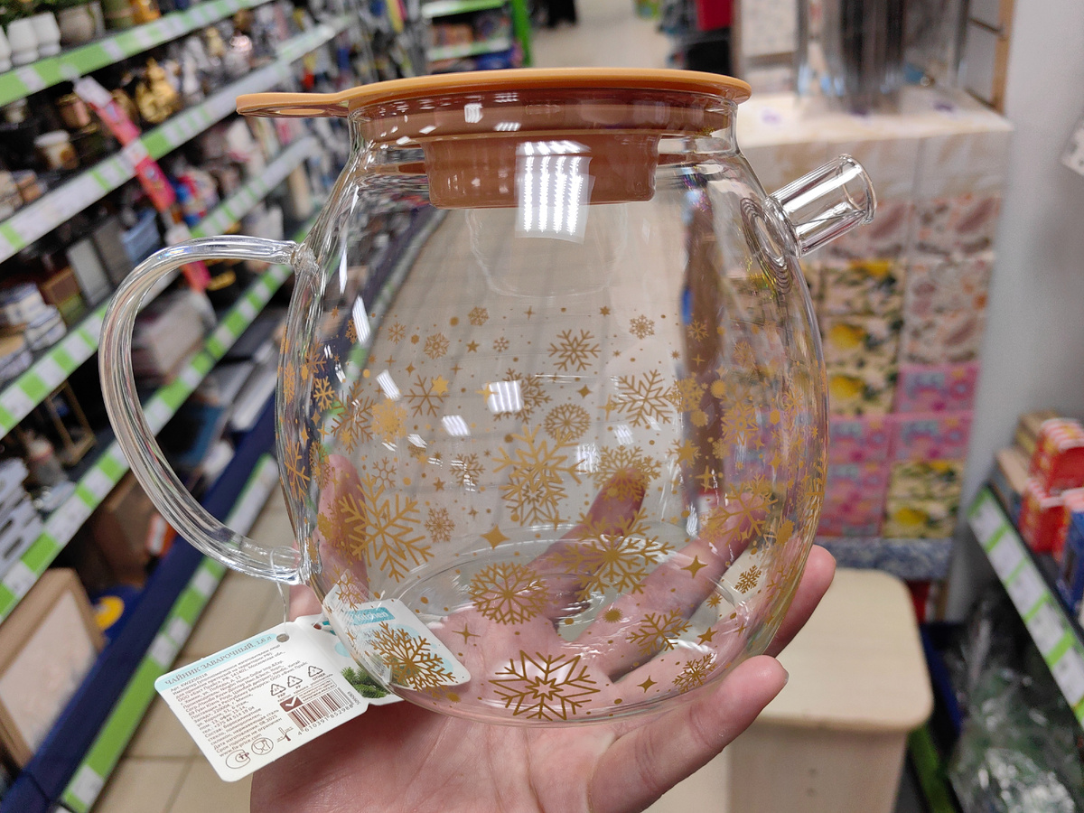 Иногда хожу и думаю, когда уже закончатся новинки в Фикс Прайс?! Только присмотришь одну, раз, и привезут еще лучше. Надо же, какие новинки, из зимней коллекции. Это чайник для заварки, с золотисто-бежевыми снежинками на стекле и с крышкой в тон. А где ситечко? Так сразу и не найти, а на деле