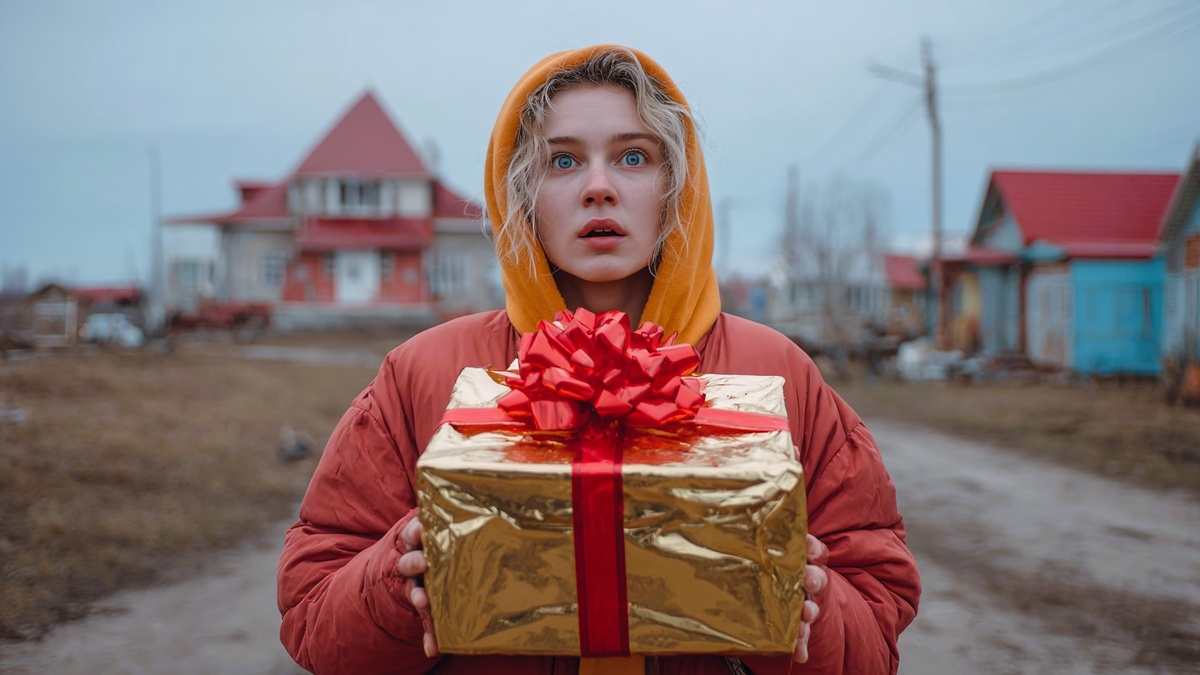 Ветер гнал по пустынной деревенской улице пожухлые листья и обрывки старых газет. Надя стояла перед обшарпанным зданием, сжимая в руках аккуратно упакованную коробку с подарком. Золотистая бумага нелепо блестела на фоне облупившейся штукатурки.