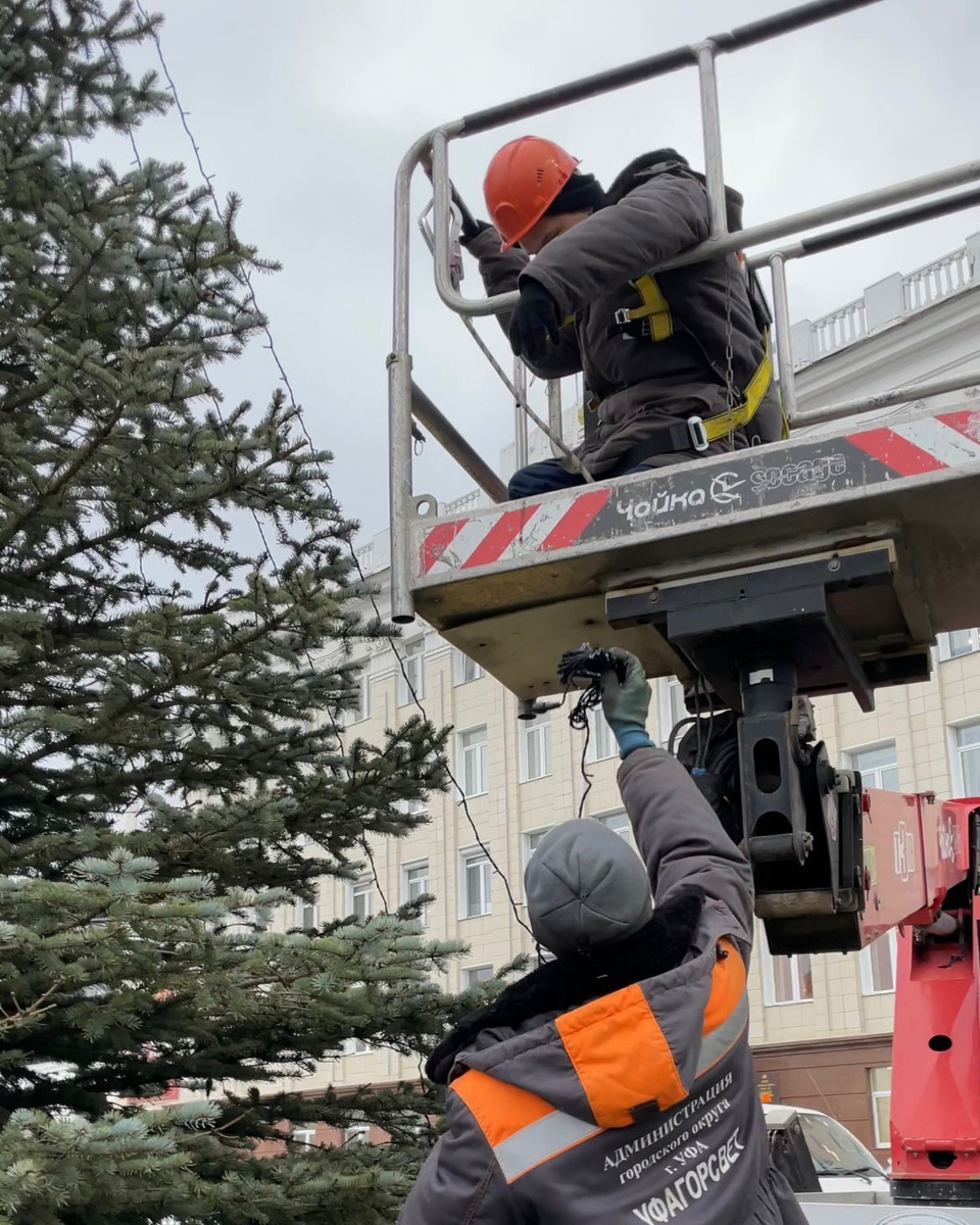 Сотрудники «Уфагорсвета» приступили к монтажу гирлянд на ёлках В Уфе сотрудники «Уфагорсвета» приступили к украшению 14 ёлок возле здания городского совета, монтируя световые гирлянды. Об этом сообщает ИА «Башинформ» со ссылкой на пресс-службу столичной администрации. Отмечается, что в настоящий момент специалисты занимаются подключением 10-метровых гирлянд, а также проверяют их работоспособность и надежность крепления. Эти работы ведутся для того, чтобы к праздничным дням создать яркое и уютное световое оформление для горожан. Подчеркивается, что общая протяженность гирлянд по всей Уфе достигает порядка 18 километров. В настоящее время городские службы проводят ревизию, ремонт и установку всех световых конструкций для праздничного оформления. Ранее «Уфимские нивы» упоминали, что в Башкирии проконтролируют реализацию новогодних елок. Фото: ИА «Башинформ».