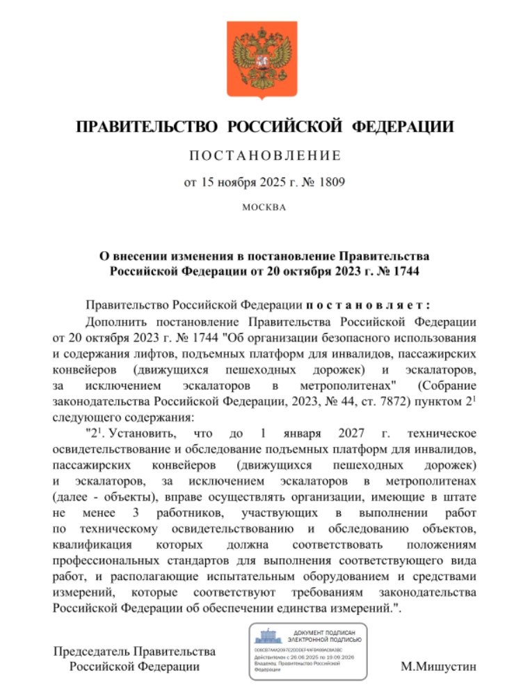 ПРАВИТЕЛЬСТВО УТОЧНИЛО ПОРЯДОК ТЕХОСВИДЕТЕЛЬСТВОВАНИЯ И ОБСЛЕДОВАНИЯ ПОДЪЕМНЫХ ПЛАТФОМ ДЛЯ ИНВАЛИДОВ, ПАССАЖИРСКИХ КОНВЕЙРОВ И ЭСКАЛАТОРОВ 🟧🟧🟧🟧 До 1 января 2027 техническое освидетельствование и обследование подъемных платформ для инвалидов, пассажирских конвейеров (движущихся пешеходных дорожек) и эскалаторов, за исключением эскалаторов в метрополитенах, вправе осуществлять организации, имеющие в штате не менее 3 работников, участвующих в выполнении работ по техническому освидетельствованию и обследованию объектов, квалификация которых должна соответствовать положениям профессиональных стандартов для выполнения соответствующего вида работ, и располагающие испытательным оборудованием и средствами измерений, которые соответствуют требованиям законодательства Российской Федерации об обеспечении единства измерений 🟧 Постановление Правительства РФ от 15.11.2025 N 1809 "О внесении изменения в постановление Правительства Российской Федерации от 20 октября 2023 N 1744" 🟧 Постановлени