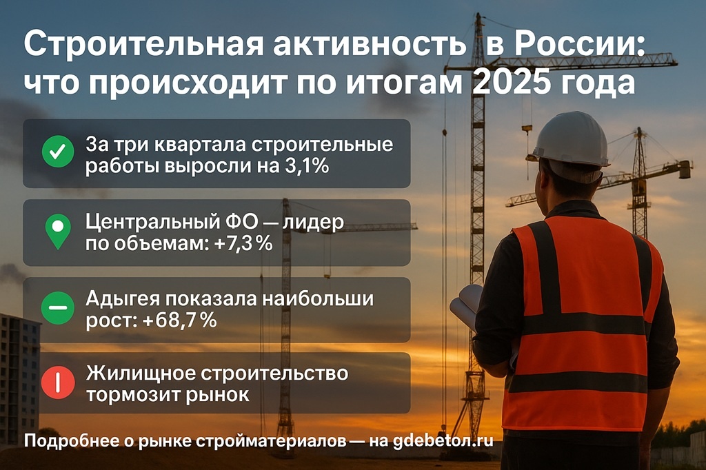 Строительная отрасль в России завершает 2025 год с умеренным ростом — но ситуация в регионах очень разная. Sherpa group опубликовала свежую аналитику, и вот самое важное простым языком. За первые три квартала 2025 года объём строительных работ вырос на 3,1% — до 12,35 трлн рублей.