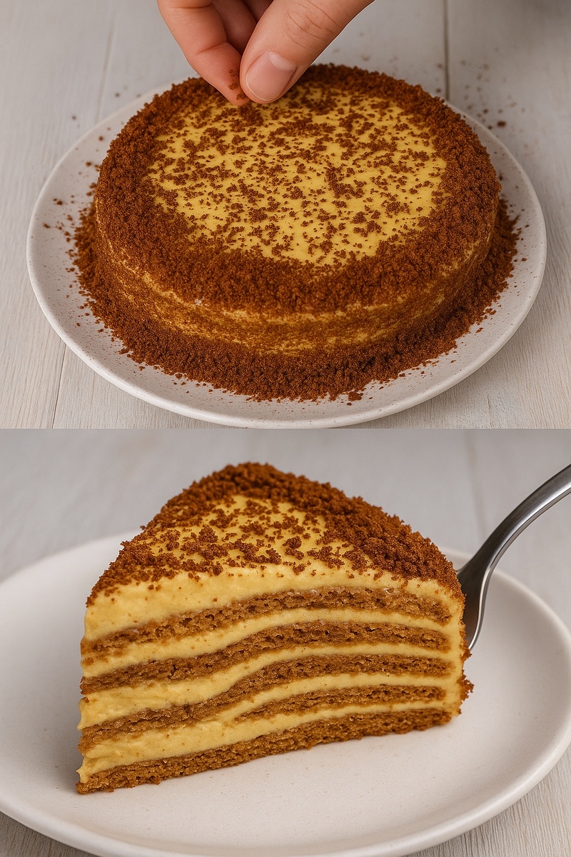 Этот торт — настоящая магия простоты! Нежные шоколадные коржи, приготовленные на сковороде, и воздушный крем из взбитых сливок со сгущенкой создают потрясающий дуэт. А шоколадная крошка добавляет изюминку этому лаконичному, но безумно вкусному десерту. Нам понадобится: Для коржей: - Яйца — 3 шт. - Молоко — 250 мл - Сахар — 180 г - Подсолнечное масло без запаха — 100 мл - Разрыхлитель — 1 ч. л. - Мука — 150 г - Какао — 3 ст. л. Для крема: - Сливки 33% — 400 мл - Вареная сгущенка — 320 г Приготовление: 1. В глубокой миске взбейте яйца с сахаром, добавьте молоко и масло, перемешайте до однородности. 2. Просеянную муку смешайте с какао и разрыхлителем, постепенно введите в жидкую смесь, тщательно размешивая. Тесто должно получиться жидким, как на блины. 3. На хорошо разогретую сковороду (диаметром 20-22 см), слегка смазанную маслом, выливайте тесто тонким слоем, как на тонкие блинчики. Обжаривайте с двух сторон по 1-2 минуты. 4. Для крема взбейте охлажденные сливки до мягких пиков,