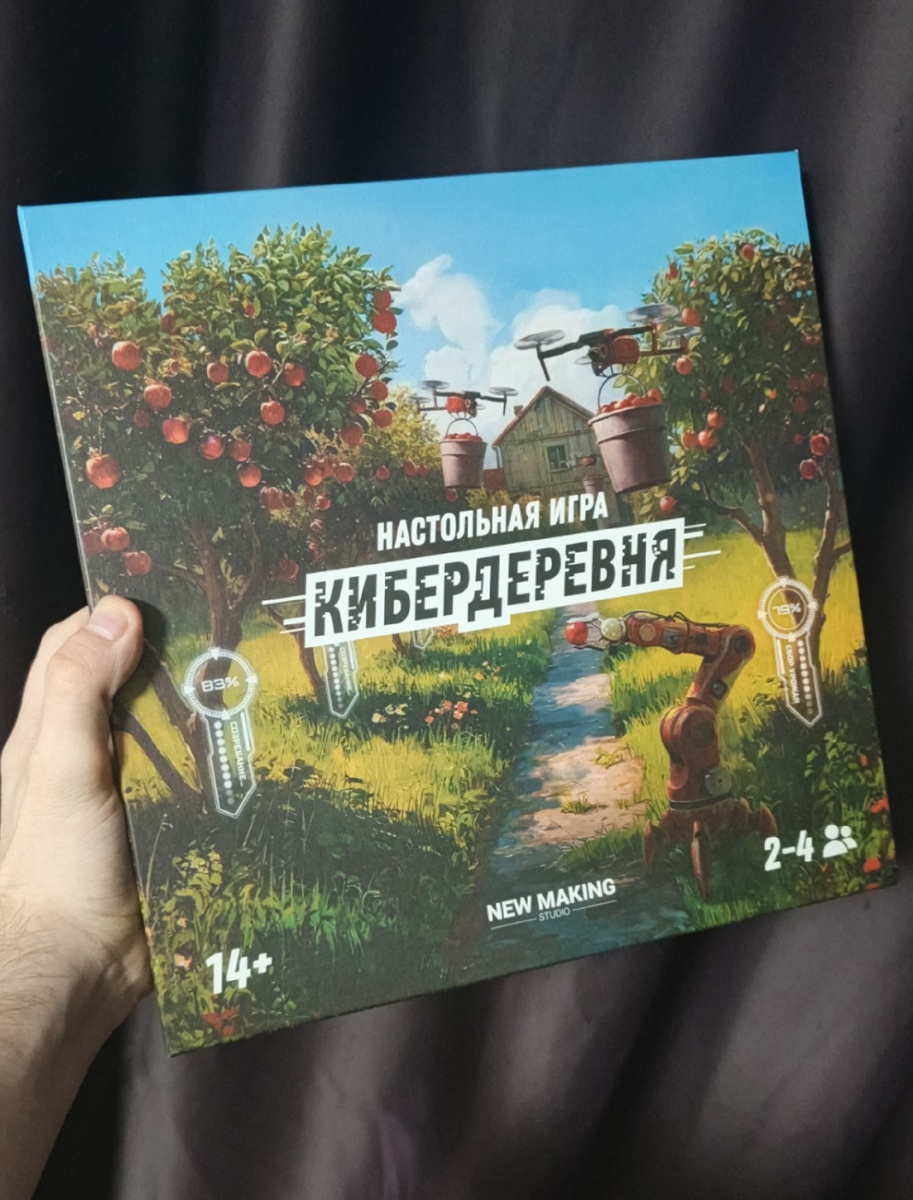 ⏺️ Ходы игроков. В свой ход игроки делают по одному действию, пока не спасуют. Так вот, что можно-то делать? Разыграть карту изобретений, использовать робота, использовать борону, выполнить заказ и в любой момент, в качестве свободного действия, можно сбросить карты за монеты по курсу один к одному. Про карты я всё объяснял, теперь про роботов, конвейеры, борону и заказы. Первое, самое основное в этой игре — это наши рабочие. Роботов на старте всего четыре, но в будущем мы можем увеличить их количество до семи. С ними всё просто, ставим в ячейки на зданиях и делаем действия, которые нам предписывают карты. Добыча ресурсов, конвертирование ресурсов в ресурсы подороже, посадка деревьев, потомство от животных принимать и всё в таком духе. Типичная жизнь фермера. Также в игре есть конвейеры, которые могут соединить нам карты. Они нужны, чтобы оптимизировать производство, ведь поставить робота на одну карту, потом другого на другую и т. д. Не очень крутой процесс по производству. Конвееры решают эту проблему, потому что соединяют карты по цепочке производства. Например, я могу соединить конвеером теплицу, где добывают помидоры, и давильню, где делают из этих помидоров сок, и всё это будет делать один робот, а не два! Вот такая оптимизация, и это правда очень полезно. Бороны заменяют нам сразу двух роботов, и можно выложить на некоторые карты, которые дают нам ресурсы. Прикольно, а самое главное, что это расширяет наши возможности на ход. Заказы — это специальные цели, которые дают нам победные очки и продвижение по треку мегалактической доставки, если обмениваем нужные ресурсы. Есть глобально три трека, и они дают нам победные очки, продвижение по другим трекам, ресурсы и т.д. Фух, вроде всё объяснил, идем дальше.