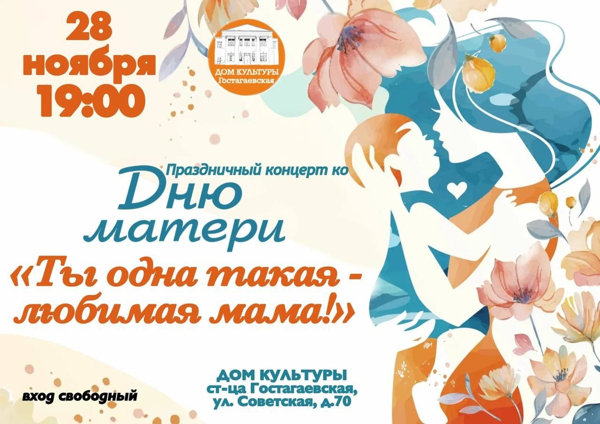 ДОМ КУЛЬТУРЫ ПРИГЛАШАЕТ… 28 НОЯБРЯ 19:00 Праздничный концерт ко Дню матери «Ты одна такая - любимая мама!» Дом культуры, ст-ца Гостагаевская, ул. Советская, д. 70 вход свободный https://gostagay.ru/news/dom_kultury_stanicy_gostagaevskoj_priglashaet/2025-11-25-1019