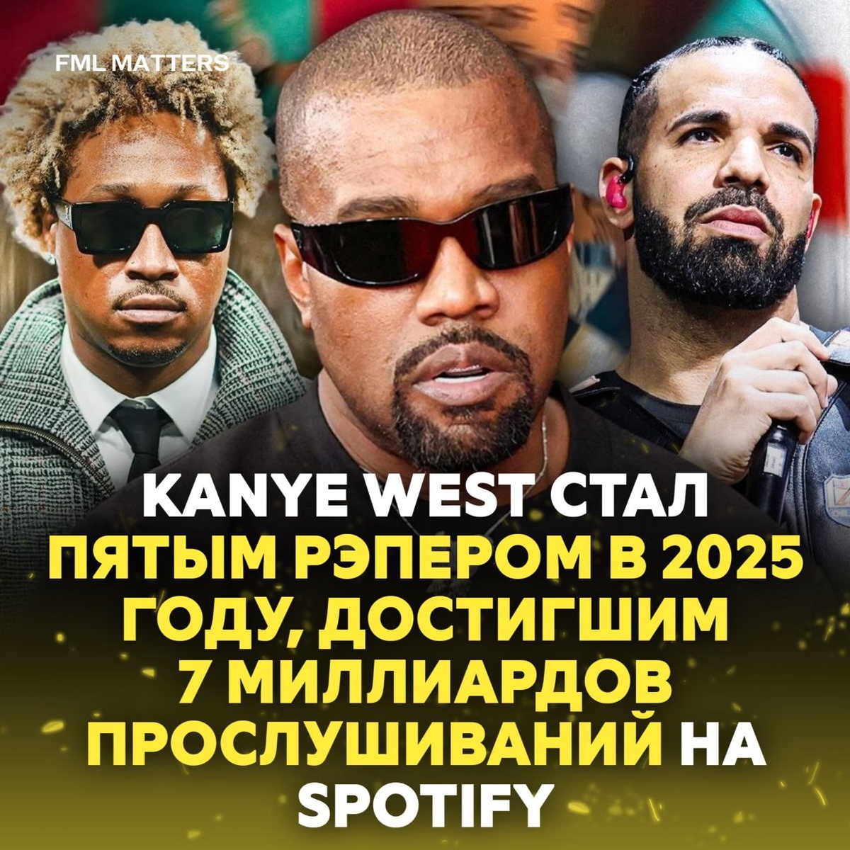 🔝 KANYE WEST ВОШЁЛ В ВЕЛИКУЮ РЭП-ПЯТЕРКУ 2025! Йе стал пятым рэпером в 2025 году, достигшим отметки в 7 миллиардов прослушиваний на Spotify — теперь он в одном ряду с Drake, Kendrick Lamar, Travis Scott и Future. Успеет ли Playboi Carti присоединиться к этому списку до конца года? 🤔 💀 FML MATTERS