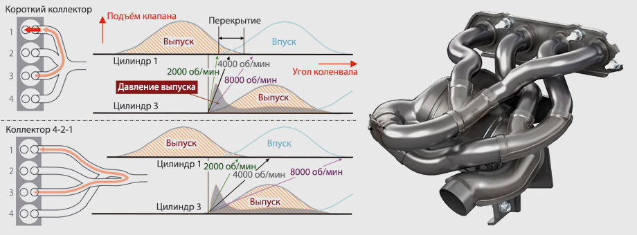 В общем коллекторе происходит интерференция волн давления. Проще говоря, выхлопной "плевок" из одного цилиндра ударяется о выхлоп другого и... часть газов забрасывает обратно в цилиндр, у которого клапана ещё не закрылись!