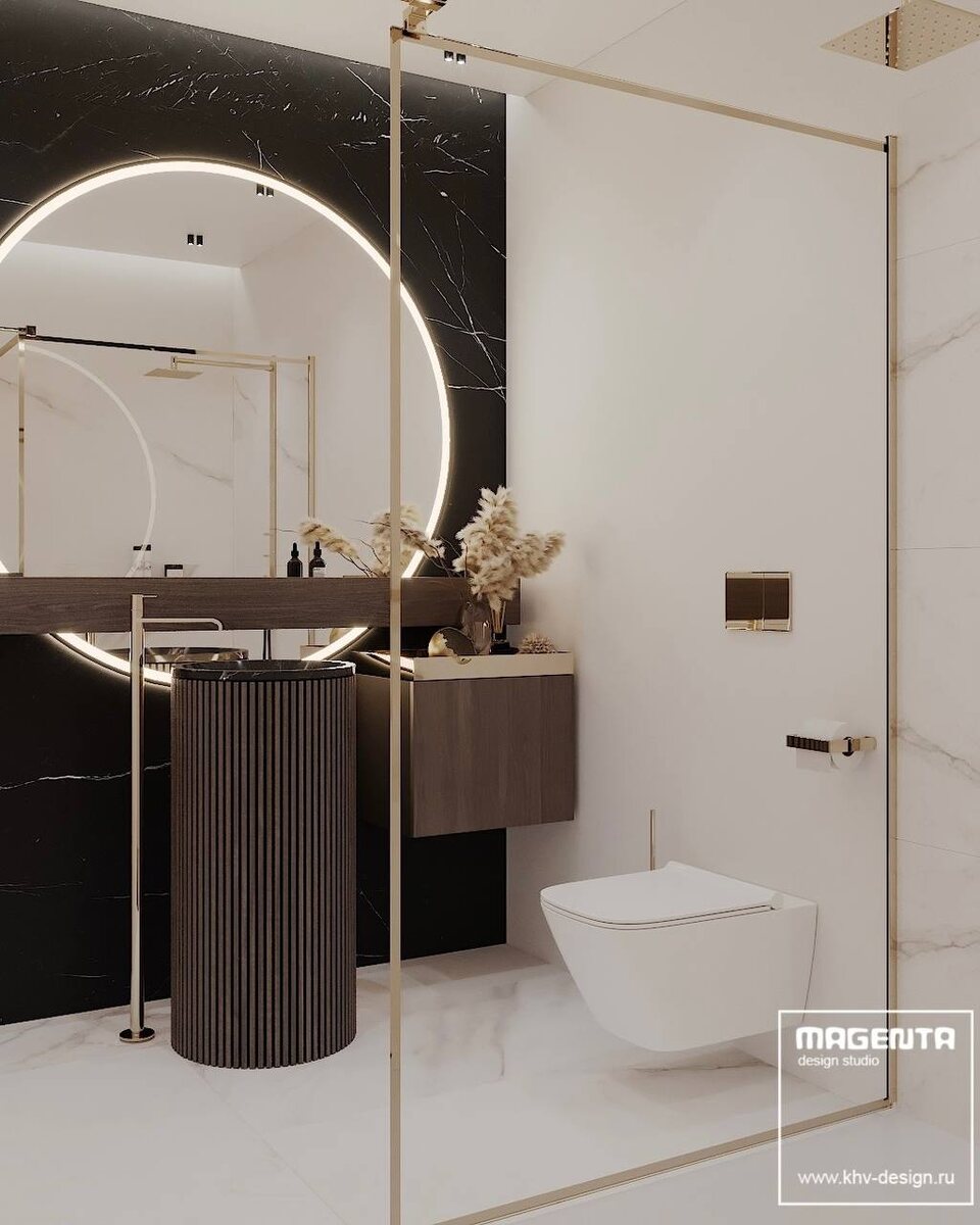 Изысканная лаконичность гостевого санузла ЖК «Культура» Этот санузел создаёт ощущение уюта и спокойствия, несмотря на компактность. Чёрный мрамор и белые поверхности усиливают контраст и глубину пространства, вызывая чувство защищённости и чистоты. Тёплый свет из-под зеркала дарит мягкость, словно рассвет в тихом уголке дома. Золотые детали добавляют нотки роскоши и тепла, делая интерьер живым и вдохновляющим. В такой атмосфере каждая деталь ощущается продуманной и важной — пространство работает не только для тела, но и для души. Прикоснитесь к дизайну класса А: портфолио реализованных проектов — на сайте magentastudio.ru Magenta