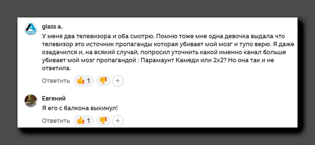 Когда-то телевизор считался настоящим «окном в мир», и каждая семья мечтала его иметь. Сегодня же он чаще называется «зомбоящиком» и используется в основном как фоновый шум или ночник. К Международному дню телевидения, который отметили 21 ноября, «Комсомольская правда» решила узнать, кто ещё остаётся верен телевизору. Оказалось, что 56% опрошенных смотрят его каждый день, хотя многие включают просто «для атмосферы». Ещё 12% заглядывают туда пару раз в неделю, 8% - раз в месяц, а 23% вообще предпочитают обходиться без него, ведь интернет удобнее, а реклама не раздражает. То есть вопрос «Для кого вообще создаются все эти телепродукты - бесконечные шоу с Гузеевыми, Андреевыми, Малышевыми, КВН и другие реликты прошлых лет?» отпадает сам собой. Тем более, что по словам аналитиков, телевизор для многих зрителей выполняет роль своего рода «ежедневного предохранительного клапана», помогая людям справляться с трудностями реальной жизни. Дескать, погружаясь в сюжет сериала или шоу, люди могут в