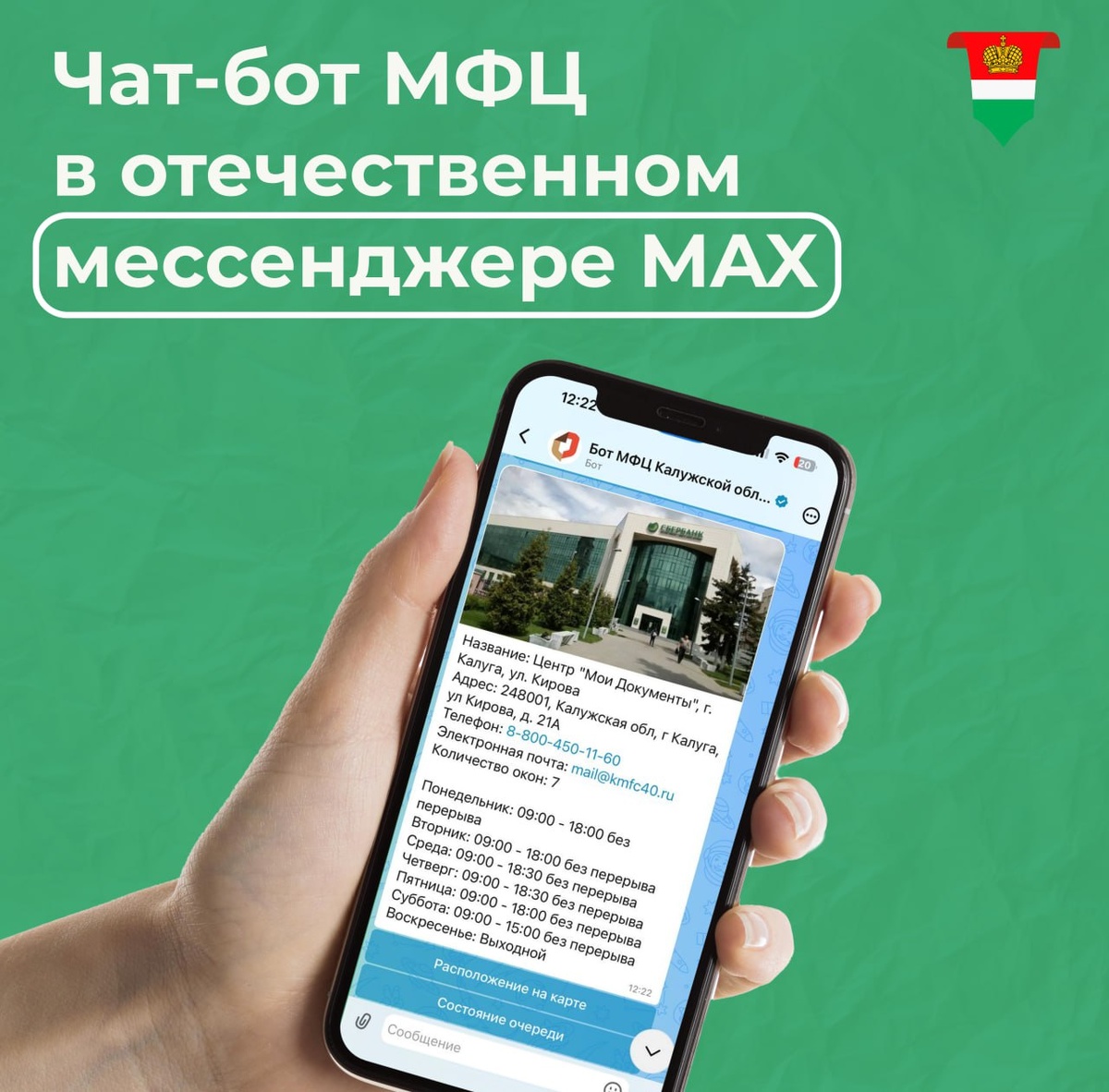 🟢В мессенджере МАX появился официальный чат-бот МФЦ Вопросы, связанные с готовностью документов и записью на приём можно задавать прямо в боте. Также чат-бот подскажет адрес, график работы и загруженность центра. Присоединиться можно по ссылке ❤️ Подписывайтесь на официальный канал Правительства в MAX