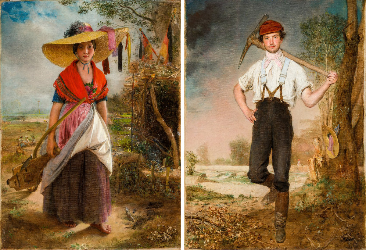 Эту очаровательную пару портретов, изображающих, по-видимому, простых сельскохозяйственных рабочих, трудно отнести к какой-либо категории, и их можно интерпретировать по-разному. Их можно рассматривать как переходный этап между идеализированным портретом и жанровой картиной, но в то же время они отражают личные и политические убеждения австрийского художника Иоганна Баптиста Райтера (1813–1890). Сын плотника из Линца, Райтер поддерживал причины Венского восстания 1848 года. Политическая и экономическая напряженность в многонациональной империи Австрии привела к отставке государственного канцлера Меттерниха и первоначальным уступкам со стороны императора Фердинанда I, и многие художники и интеллектуалы приняли участие в последовавших вооруженных столкновениях бок о бок с представителями рабочего класса. Двое, изображенные в расцвете юности на идиллическом фоне с символикой революции, на самом деле являются художником и его первой женой, Марией Анной Хофштеттер. Баррикады и траншеи, р