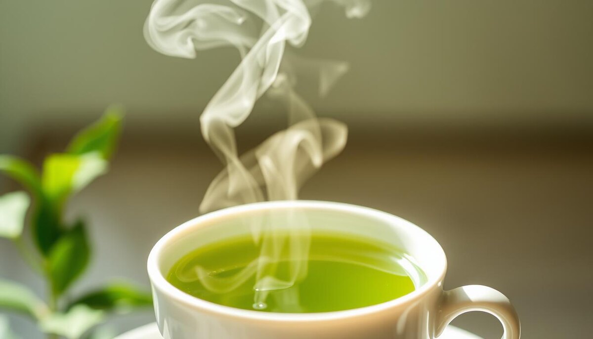Яркое и безмятежное изображение дымящейся чашки зеленого чая. На переднем плане видно, как разворачиваются нежные листья зеленого чая, их зеленые оттенки подсвечиваются мягким естественным освещением. Пар, поднимающийся от чашки, создает ощущение тепла и умиротворения, в то время как гладкая, элегантная керамическая кружка создает тактильный контраст. Простой деревянный стол или поверхность, выполненные в стиле минимализма, позволяют чаепитию занять центральное место. Фон слегка размыт, что создает впечатление спокойной домашней обстановки, возможно, уютной кухни или безмятежного пространства на открытом воздухе. Общая атмосфера - это умиротворяющая простота, приглашающая зрителя остановиться и насладиться вкусом зеленого чая.
