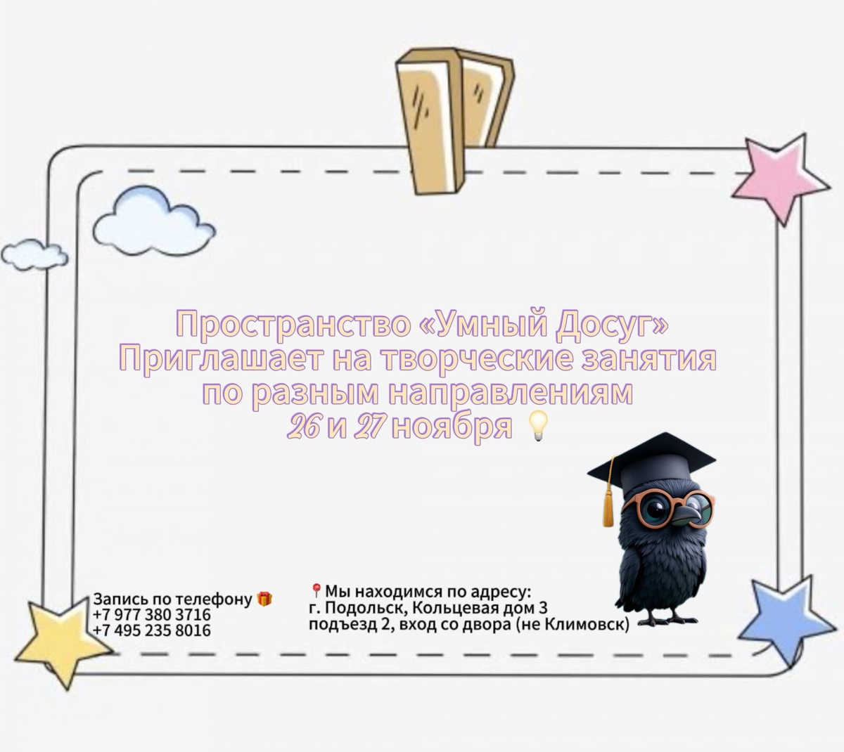 ✨ Приглашаем всех детишек, на увлекательные занятия 5+ по разным направлениям🌸 🗓️Расписание занятий на 26 ноября ⏰11.30 - Рисование ( жираф на холсте ) ⏰16.00 - Роспись имбирных пряников ⏰18.00 Просмотр короткометражного мультфильма с викториной и мороженым🍦. 🗓️Расписание занятий на 27 ноября ⏰11.30 Рисование гуашью, королевский корги. ⏰ 17.00 Логические игры *Есть возрастное ограничение 6+ Запись уже открыта по ☎️ 89773803716 📆 26.11.2025 🕒 11:30 🏢 Досуговый детский центр "Умный досуг" 📍 г. Подольск, ул. Кольцевая, 3, под. 2 💰 Цена от: 400 до 500 ₽ ⭐Поддержать канал голосом 🍰Где поесть в Подольске ✅ Мероприятия Подольск https://dzen.ru/id/66ed500f7b5671493eca3fd6 http://vk.com/podolsk_events http://dzen.ru/podolsk_events