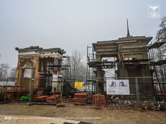 В Центральном парке культуры и отдыха имени Ленина в Белгороде идут реставрационные работы на объекте культурного наследия — главной входной арке. Специалисты воссоздают ее первоначальный исторический вид, используя архивные материалы середины прошлого века. Основные работы уже позади. На месте установлено и отделано десять колонн будущей ограды центрального входа. Сейчас строители готовят к финальной отделке цокольную часть между ними. В ближайшее время ее закроют плитами из архитектурного бетона, после чего можно будет приступать к монтажу кованого металлического ограждения с ажурными чугунными элементами. Значительный объем работ был проведен по усилению конструкции самой арки, находившейся в неудовлетворительном состоянии. Фундамент был укреплен, а на наиболее поврежденной левой части выполнен капитальный ремонт кирпичной кладки. Правая часть арки уже полностью готова — ее оштукатурили и увенчали восстановленным шпилем. Параллельно с работами на площадке в реставрационных мастерски
