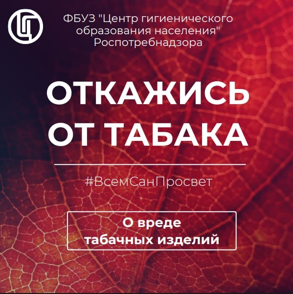 Управление Роспотребнадзора по Московской области напоминает жителям м.о. Чехов о вреде табака и никотинсодержащей продукции. Во всем мире курение ежегодно убивает более 7 млн человек, из них около 1,6 млн – некурящие, подверженные воздействию пассивного курения. В России курят около 18,5% жителей старше 15 лет: большинство начинают курить в возрасте 15-20 лет; самая активная группа курильщиков – 36-40 лет. Курение – это одна из главных причин: - рака легких; - хронической обструктивной болезни легких (ХОБЛ); - частых бронхитов, пневмоний; - болезней сердца и сосудов: повышает риски инфаркта, инсульта, ускоряет развитие атеросклероза; - потерь беременности, нарушений развития плода. Пассивное курение не менее опасно, оно повышает риск: - инсульта; - рака легких; - сердечно-сосудистых заболеваний. Особенно уязвимы дети – пассивное курение связано с синдромом внезапной детской смерти, частыми респираторными инфекциями, отитами, астмой, постоянным кашлем и замедлением роста легких. Табачн