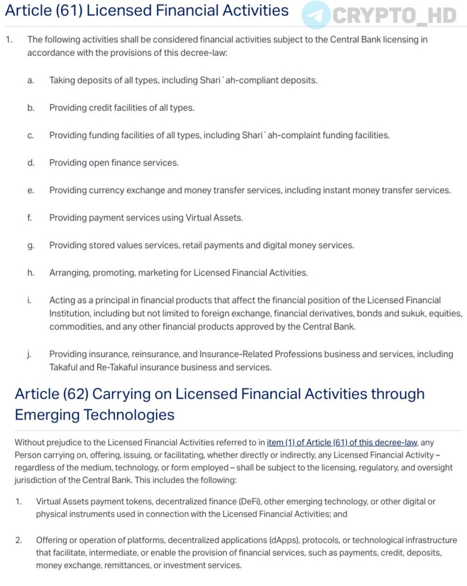🇦🇪 DEX, кроссчейн-мосты, DeFi-протоколы, стейбкоины и Web3-инфраструктура официально подпадают под надзор ЦБ ОАЭ. Новый закон «Federal Decree Law No. 6» расширяет полномочия ЦБ и делает любые операции с цифровыми активами частью финансовой деятельности. Основное: ➠ «Мы просто код» больше не считается оправданием. Даже децентрализация не освобождает от требований правительства (лицензии). ➠ Любые криптовалютные сервисы с платежами, обменом, хранением или переводами требуют лицензии ЦБ. ➠ Штрафы за работу без лицензии – до $272m + возможная уголовная ответственность. ➠ Self-custody не запрещается – требования касаются только компаний. ➠ Переходный период – до сентября 2026 года. Cryptо Headlines