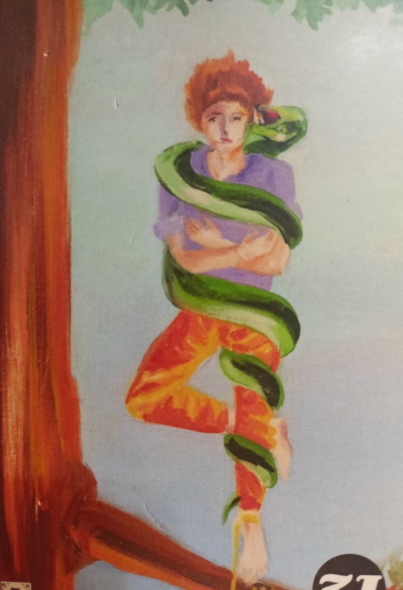 «Девушка стоит на ветке на одной ноге, обвитая змеей.
